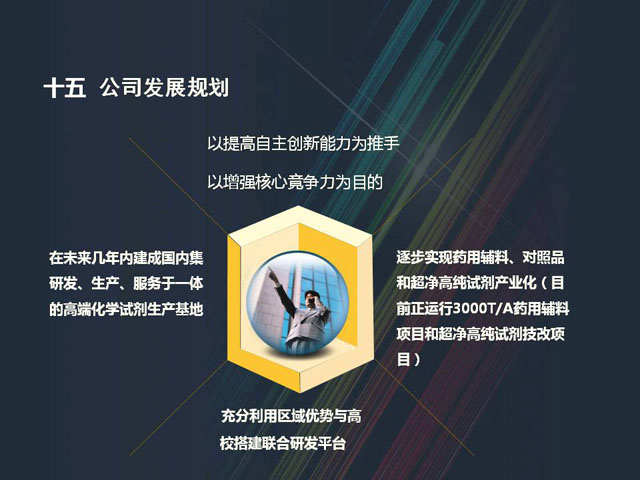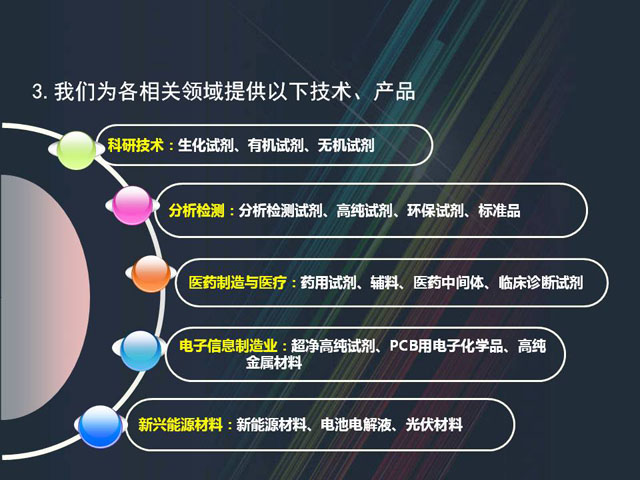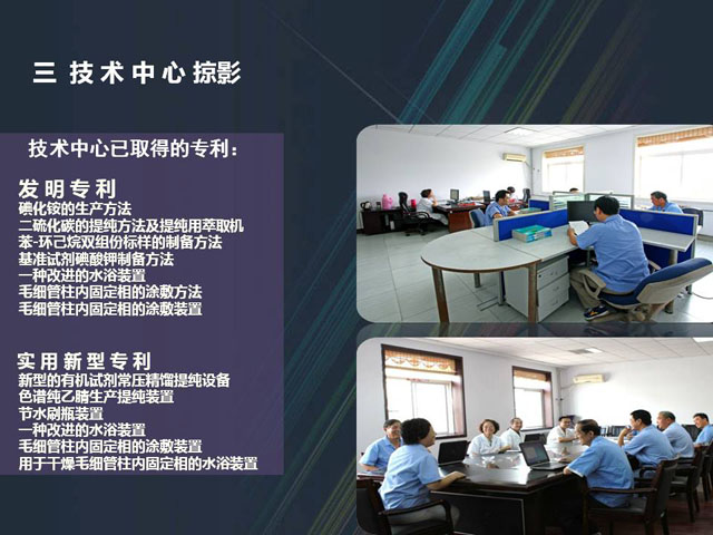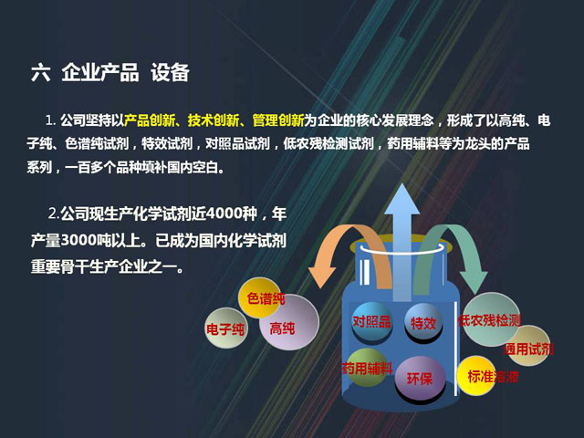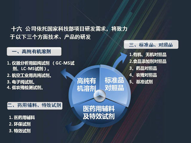 公司始终坚持以产品创新、技术创新、管理创新为企业的核心发展理念,形成了以高纯、电子纯、色谱纯试剂,特效试剂,对照品试剂,低农残检测试剂,药用辅料等为龙头的产品系列,其中一百多个品种填补了国内空白。 2011年联合上海理工大学、上海化工研究所等单位,申请了国家科技部 科研用试剂的第三大任务,并与南开大学、天津化学试剂研究所共同合作签订了三大研发项目(一是高纯有机溶剂,二是药用辅料及特效试剂, 三是色谱对照品。)
