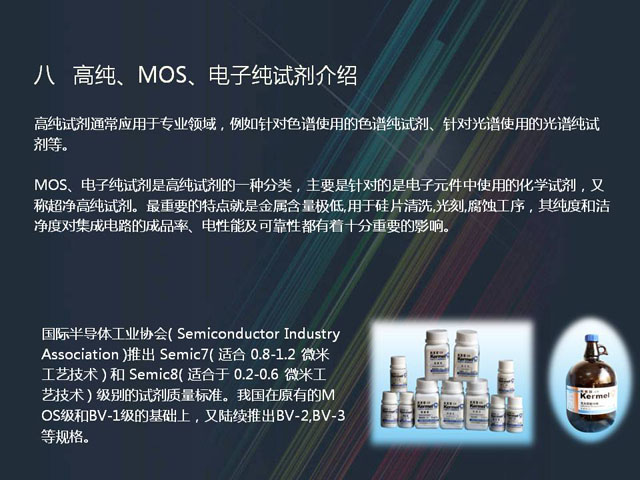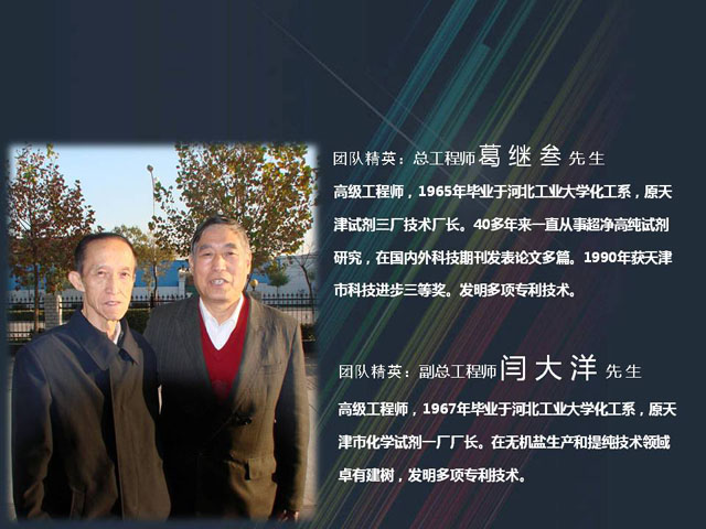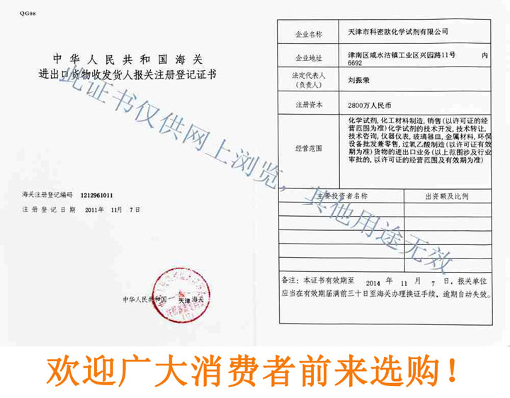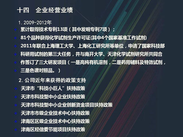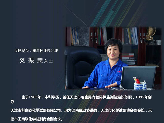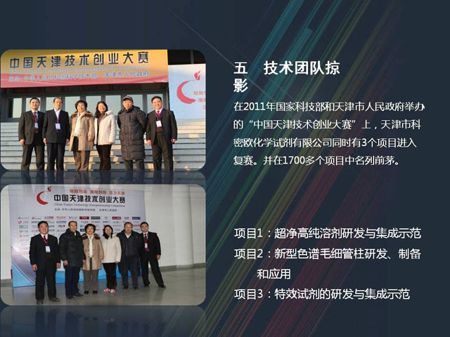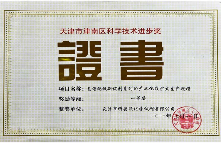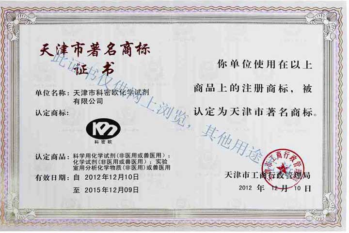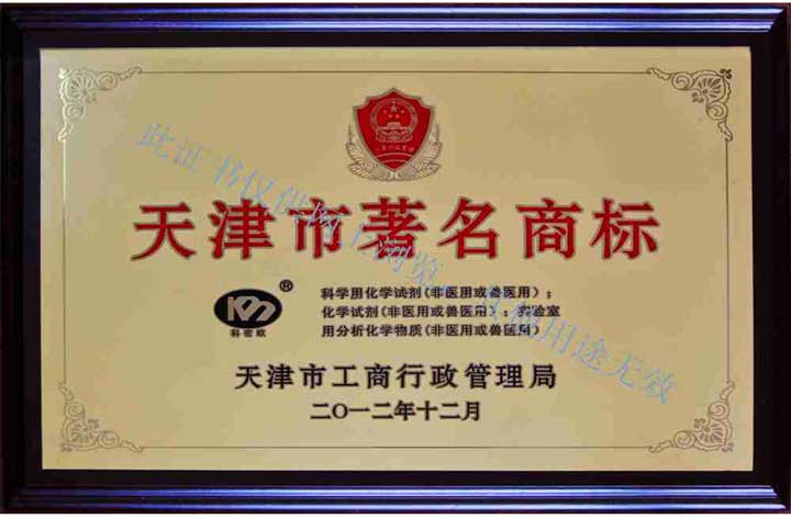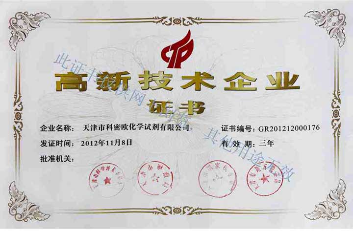 科密欧化学试剂简介 成立于2003年,建筑面积34000平方米(老厂),注册资本2800万元,是天津市化学试剂标准化成员单位,天津市工商联试剂商会会长单位。 天津市首批科技型中小企业,2011年国家科技部科研用试剂研发第三大任务的牵头单位。公司拥有12项专利,其中6项专利为发明专利。主要生产化学试剂产品。目前公司生产卡尔费休、对照品、标准品、色谱纯(含离子对试剂)、高纯MOS级、电子纯、低浓残检测、环保、基准、特效、分析纯、优级纯、标准溶液、消毒剂、药用辅料、等15个系列,近4000个品种,广泛应用航天、航空、制药、环保、电子信息、大专院校、科研院所及检验机构。截止2011年底国内试剂行业评比中,公司在产品品类、产品质量、产品性价比三项指标均居于前三,企业综合指数位居国内同行业前六。