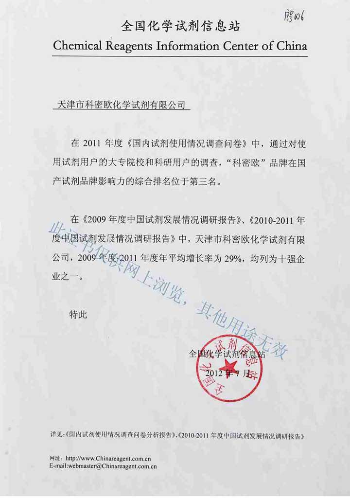 10、2010~2011年中国试剂发展情况调研报告中,天津科密欧被例为“全国试剂行业10强企业之一”,且在全国试剂行业问卷调查中,科密欧在“综合评价、质量好、性价比高、品种全”等多项指标中,均排在全国前三名。