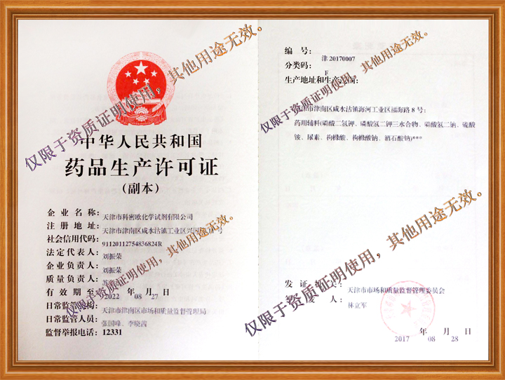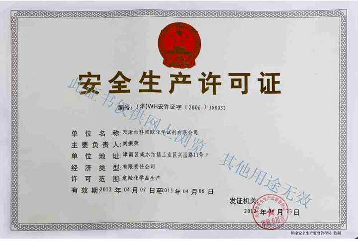 公司在行业率先获得ISO9001:2008质量管理体系认证;ISO14001:2004环境管理体系认GB/T28001:2001职业健康安全管理体系认证;“天津市安全生产许可证”、“全国工业产品生产许可证”。