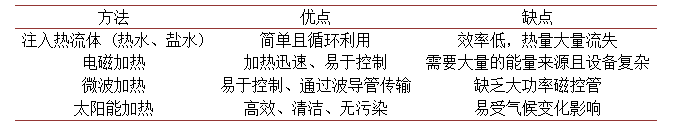 目前热开采技术包括注热水/蒸汽/热盐水、井下加热/燃烧、利用海底地热、电磁制热、微波导热、太阳能供热等。根据热量提供的不同方式可进一步分为两类: