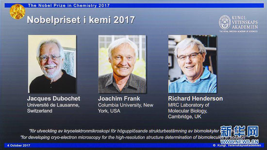 10月4日,在瑞典斯德哥尔摩,获得2017年诺贝尔化学奖的瑞士科学家雅克·杜博歇、美国科学家约阿希姆·弗兰克以及英国科学家理查德·亨德森(从左至右)的照片显示在屏幕上。新华社发(石天晟摄)