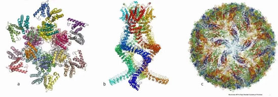 在过去的几年里,研究人员发布了大量复杂蛋白质复合物的原子结构。a为一个控制昼夜节律的蛋白质;b为耳内的一个感受压力变化的传感器,让我们能听到声音;c为Zika病毒。
