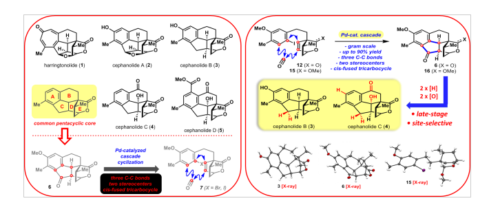 近日,陕西师范大学通过设计和发展新颖的金属钯催化串联环化反应及后期连续的高选择性sp3C-H键氧化反应,为这类天然产物的多样性高效合成发展了全新的策略和方法。在此基础上,实现了这一家族中Cephanolide B和Cephanolide C的首次化学全合成,并把这一研究成果在线发表在国际顶尖化学期刊《美国化学会志》。