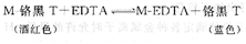 铬黑T在pH 8~11时呈现蓝色,它与Ca2+、Mg2+、Zn2+等金属离子形成的配合物呈酒红色。EDTA滴定这些金属离子时,加入铬黑T指示剂,滴定前它与少量金属离子形成酒红色配合物,而大多数金属离子处于游离状态。随着EDTA的不断滴入,游离金属离子逐步被配位形成配合物M-EDTA。当游离的金属离子几乎完全配位后,继续滴加EDTA时,由于EDTA与金属离子形成的配合物(M-EDTA)的条件稳定常数大于铬黑T与金属离子形成的配合物(M-铬黑T)的条件稳定常数,因此,EDTA夺取M-铬黑T中的金属离子,从而将指示剂释放出来,溶液显示出游离铬黑T的蓝色,指示滴定终点的到达。其反应方程式如下: