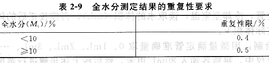 全水分测定结果的重复性要求见表2―9规定。