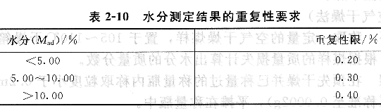 水分测定结果的重复性要求见表2-10规定。