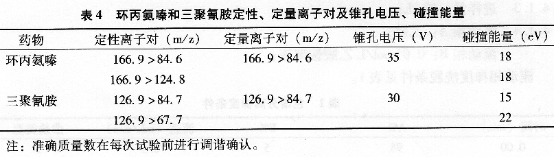 9.4.2.4定性、定量离子对、锥孔电压和碰撞能量见表4。