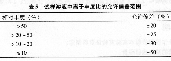 9.5.4.4试样溶液中的离子丰度比应与校正溶液的一致,容许偏差符合表5的要求。