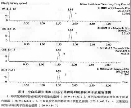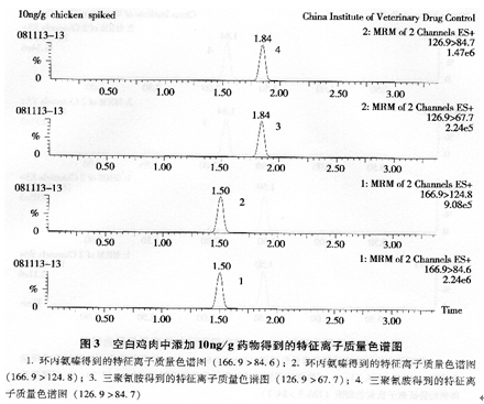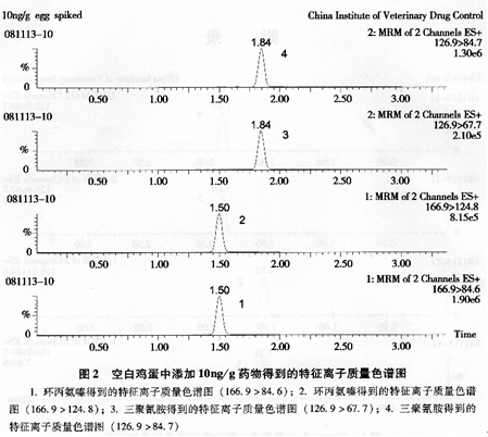 环丙氨嗪及其代谢物三聚氰胺在鸡蛋、鸡肉和鸡肾中的检测限lμg/kg,定量限为2.5μg/kg。