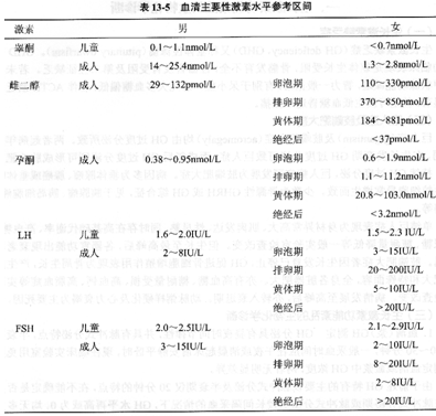 目前性激素大多采用免疫化学法测定包括游离和结合两部分的总浓度。血中性激素水平特别是雌激素水平,在不同的发育阶段及女性月经周期的不同时期存在较大的差异(表13-5)。单次测定结果,并不一定能真实地反映性腺的内分泌功能,大多需进行必要的动态功能试验,才可对性腺内分泌功能状态作出诊断。性激素分泌虽无明显的昼夜节律,但每天中仍有一定波动。通常清晨高于下午,青春期这种波动更明显。为便于比较,一般均在8∶00取血。