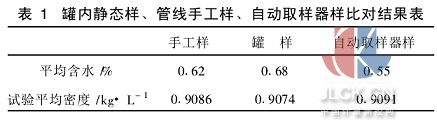 我公司从仪长线交接取得原油,但是收油罐油量经常亏损。为此对管线自动取样、管线手工取样及罐内静态样进行了比对。仪长线长岭站的流量计前垂直管道上安装的是徐州城信自动取样器厂制造, LLAS-D型自动取样器。单次取样量11m,l 8h取样1200m,l取样间隔时间4′24″,另外在流量计后安装有手工取样管,一般每2h取样1次,每次300ml。收到原油,进3万m3外浮顶保温罐,比对时截取48h量换罐,油罐取组合样,原油流量250~280m3/h。2006年10月对罐内原油样、手工样、自动取样器样进行比对结果如表1。