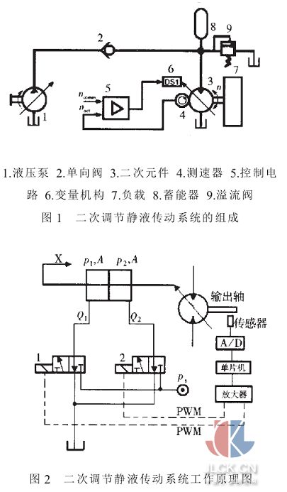 图2 所示为二次调节静液传动系统,二次元件的排量由液压缸进行控制,液压缸的位移通过高速开关阀1,2调节。二次元件转速的变化,通过二次元件转轴上的速度传感器测出。由速度传感器检测到的转速信号经A/D转换后得到数字信息输入到单片机的数据存储器,经CPU比较处理后,产生控制指令(PWM控制信号)经放大器驱动高速开关阀1,2的开闭,完成对二次元件的转速控制。