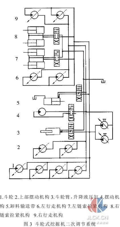 图3为某大型斗轮式挖掘机的液压系统原理图,其初级仅由2个驱动功率为300 kW的主泵组成公用油源(供油及控制用辅助泵未画出),供应次级完成9种液压功能。而采用传统的液压传动方案则初级至少需7个泵,且传动余度小。采用二次调节的另一优点是初级可布置在远离次级的任意位置,例如它可做为对斗轮的平衡重被装入。当然二次调节液压系统在次级方面由于需采用过量变量马达,费用要高些,只有在设计合理并且在满负荷下,二次调节的优点才能显现出来,并且公用恒压供油网路供应的用户越多,优点越明显。