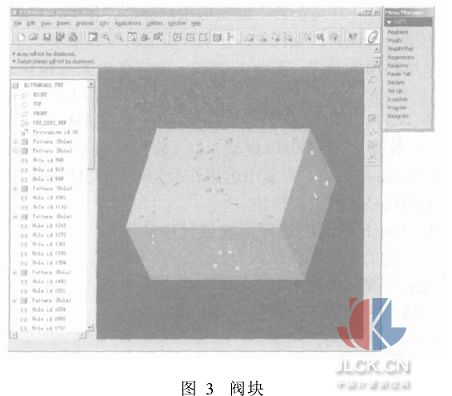 (3)针对原理图,在实体上核对阀的位置和工艺孔的深度、位置、大小。由于Pro/E有方便的三维视角,可以从各个不同的侧面查看阀块上工艺孔的定位尺寸和定形尺寸,以及油路的干涉问题。如果发现问题可以及时修改,而且很容易的进行重绘。真正做到了所见即所得的效果。最后形成的实体如图3所示,可以满足厂家对阀块的要求。