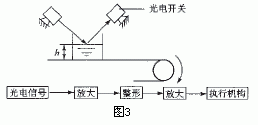 用容积法计量包装的成品,除了对重量有一定误差范围要求外,一般还对充填高度有一定的要求,以保证商品的外观质量,不符合充填高度的成品将不许 出厂。图所示为借助光电检测技术控制充填高度的原理。当充填高度h偏差太大时,光电接头没有电信号,即由执行机构将包装物品推出进行处理。