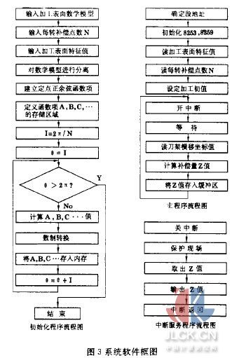 本文采用的控制方法是将上述两种方法结合起来。对数学模型进行整理、分离;将其中有规律可循的量或项在初胎化程序中计算出来,存人计算机内存。加工时,从内存中取出所需数据,再进行一些简单运算,然后进行控制,这样即节省了内存,又缩短了计算时间;刀架的进给误差和主轴转速误差对加工精度没有影响。系统软件框图(见图)。