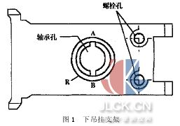 飞机某型发动机下吊挂支架如图1所示,其图号为0901059,材料是40CrNiMoA,每台发动机中的总数量只有一件。因为在发动机运行期间主要受力部位是其万象接头轴承面、螺栓固定孔周围以及加强部位。在发动机返厂大修中,列为无损检测项目,用磁粉探伤法检查上述三处受力部位,检查后合格件的验收标准是不允许裂纹。然而,自去年以来,对该件实施磁粉探伤时,在万向接头轴承面孔缘外部周围的R处的A、B两侧常常有类似裂纹磁痕的可疑显示,这给探伤工正确识别和判断真假缺陷带来了麻烦。在发动机零备件目前奇缺的情况下,为了保证探伤质量和修理质量、避免盲目报废、降低修理成本,特立项分析研究,彻底搞清该部位类似裂纹磁痕显示的原因以及真伪实质。