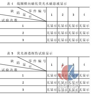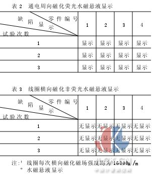 表1、表2、表3中磁粉探伤试验时的磁化电流采用50Hz的交流电、TC―9000A磁粉探伤机、非荧光黑色水磁悬液、荧光磁悬液显示。