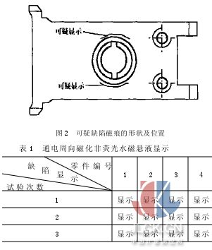 2.2.1由表1、表2可知,该可疑缺陷磁痕显示只是在磁粉探伤周向磁化时出现,而且它的位置总是位于轴承孔缘的外部R处,方向与支架轴线方向一致,磁粉堆积不致密,缺陷磁痕不典型。