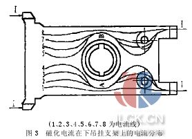2.2.5假设磁化电流在下吊挂支架上的流动分布如图3所示,则由图3可以看出,当电流从下吊挂支架上通过时,电流流动的路径并不是均匀的,2、3、4、5、6、7电流线在通过轴承孔时,在A、B两侧发生了严重畸变,改变了流动路径。从而使A、B两处的电流密度急剧增加,此时A、B两处的磁化电流为:IA=IB=2960÷2=1480(A)2960是现行工艺规程中所给出的剩磁法检查通电周向磁化电流安培数,当把下吊挂支架按板件对待时,其两底角之间的最大宽度为b,b=185mm,故有
