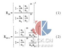 传统的介质高反射膜采用的是高低2 种折射率材料叠加光学厚度为λ/4 周期性多层膜结构, 从多层膜的特征矩阵[9]出发, 对于周期膜系S, 可以得到偶数层2S 和奇数层2S+1 在中心波长λ0 处的反射率分别为: