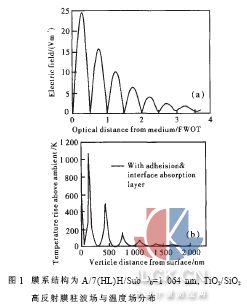 对于高功率激光系统中的反射镜, 高的反射率水平并不能直接反应反射镜抗激光损伤的强度, 即激光高反射膜的损伤阈值。设计具有高损伤阈值的激光反射膜时必须考虑激光在膜层中的驻波场和温度场的分布情况。已知激光在膜层中传播时入射光和反射光的干涉在薄膜内形成了驻波场, 在薄膜内部吸收系数处处相等的区域, 驻波场强越大, 该区域的吸收损耗越大。对于标准的λ/4 高反射膜系, 驻波场强最大峰值位于最外层膜和其相邻一层膜的交界面上, 最大强度为4n02/nH2,次极大按比值nL2/nH2 成比例减少, 越到膜层内部, 驻波场强越小; 所以高反射膜的损耗, 主要取决于靠近入射媒介的最外几层膜的吸收系数大小和驻波场强的分布, 在可见光区和近红外区, 高折射率材料的消光系数一般要比低折射率材料大一两个数量级, 损伤往往是发生在最外侧几个膜堆中的高折射率膜层。对于高功率激光薄膜, 最终导致薄膜损伤或失效的是其局部温升, 研究薄膜的激光破坏, 必须考虑薄膜内部的温度场分布, 薄膜内的峰值温度随吸收系数急剧增加, 通过计算常规的λ/4 高反射膜系的驻波场( 见图1( a) ) 和温度场( 见图1( b) ) 分布[6]可以看出, 在薄膜材料以及各种吸收特性相同的条件下,高反射膜层的温度场分布直接取决于驻波场的强弱,如图1 所示。