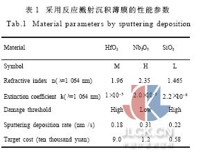 根据上述分析, 提出膜系结构: Substrate / (HL)m2L (ML)nM 2L / Air ( m>n) , 从膜系的实际制备情况出发进行光学薄膜的优化设计, 这里给出采用双离子束反应溅射沉积制备HfO2、Nb2O5 和SiO2 薄膜的性能参数, 实验装置及沉积工艺参数见参考文献[10], 以此进行膜系设计。