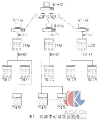 现场级网络采用RS- 485网络, 它是一种在工业现场得到了广泛应用的网络标准, 具有很强的抗共模干扰的能力和良好的通用性及可扩散性, 能实现多点远程通讯, 通讯距离可达1200m, 通讯速率为(9.6~115.2)kbps,尤其适用于远程分布式数据采集系统。在本系统中用于实现智能数据采集模块与智能控制器之间以及智能控制器与上位机之间的通讯。网络介质采用双绞线。管理级网络通过服务器与厂ERP网相连, 将能源计量系统作为ERP系统中的一个子系统, 为ERP系统提供有关的能源计量数据和信息。