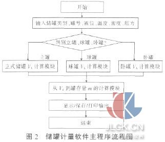 储罐按其外形可分为立式储罐、球罐、卧罐, 它们的罐容(Vh) 计算方法不同, 但从罐容到罐存量的计算是相同的, 所以储罐集中实时计量软件可以分为5个模块, 即主程序( 输入输出功能) 模块、立式储罐Vh( 液位h对应的容积) 计算模块、球罐Vh计算模块、卧罐Vh计算模块、从Vh到罐存量m的计算模块, 其集中计量软件主程序流程如图 2 所示。
