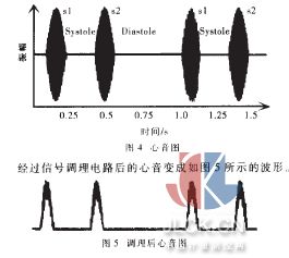 该可视听诊器由采集处理和波形显示二部分组成, 具体由声音传感器、信号调理采样电路和键盘显示电路组成。由于听诊器接收到的是微弱的宽带频率信号, 因此由声音传感器转换成电信号后, 需要经过滤波检波放大电路心音是能反映心脏正常或者病理的音响, 它是由于心脏搏动过程中各瓣膜的开闭以及心肌和血液运动所产生的震动形成的。心音听诊是诊断心脏疾病的重要依据。传统的方法是采用听诊器听诊心音, 诊断的依据主要是医师的经验。这种方法比较简单, 但由于人耳对声音的感知是声强与频率的综合效应, 因而有些病理特性难以捕捉, 且准确性较差。设计一种新的电子听诊器对听诊音进行定量、准确的分析很有必要。目前, 国内电子听诊器产品的价格和功能与国外相比还存在较大差距, 多数只是将心音采集后放大, 虽然在一定程度上改良了听诊器, 但是还不能很好地反映心音波形。