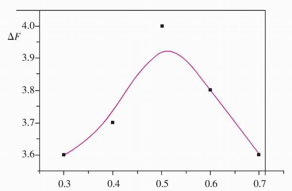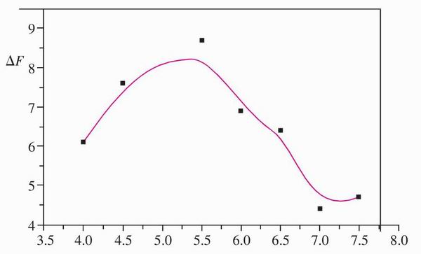 缓冲溶液pH对体系荧光强度的影响如图1所示,由图1可见,缓冲液pH在4.6~7.1之间时,ΔF达到最大。故本实验选用pH值为5.5的缓冲液进行研究。