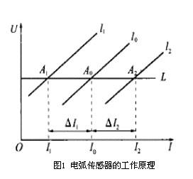 L为电源外特性曲线,在稳定焊接状态时,电弧工作点为A0,弧长L0 ,电流I0 ,当焊炬与工件表面距离发生阶跃变化增大时.弧长突然被拉长为L1.此时干伸长还来不及变化,电弧在新的工作点A1.燃烧,电流突变为I1,电流瞬时变化 为△I1反之亦然。从上述分析可以得出,电弧位置的变化将引起电弧长度的变化,焊接电流也相应变化,从而可以判断焊炬与焊缝间的相对位置。