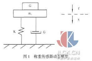 称重传感器的动态模型如图 1 所示。图中,K 为弹簧刚度(N・m),C 为阻尼常数(N/m2),m0为传感器本身的等效质量,G 为被称重物的重量,B为基座,通常基座的质量很大,故认为它处于静止状态。因为重物与托架之间不是固定联接的,所以,需要两个方程来刻画上述的称重传感器 的动态特性。