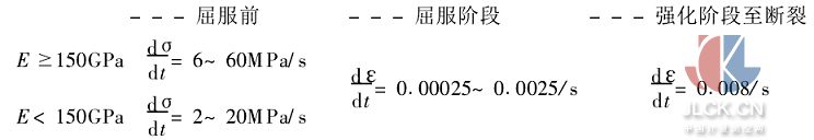 就材料试验机而言,如果材料试验时所加应力速率及应变速率的不同,试验所测得的有关强度数据就有差别。故金属拉伸试验中要求在施加载荷时,必须考虑加载的应力速率及应变速率。在国际标准ISO6892: 1998 (E)[2]及国家标准GB/T 228-2002[3]中,试验条件有如下规定: