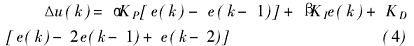 如果采用增量式PID控制,控制系统控制效果理想与否取决于控制参数KP、KI、KD的调整。比例作用KP加大将会减小稳态误差,提高系统的动态响应速度,但同时系统超调量大;积分作用对系统的稳定性有影响, KI减小会使系统不稳定,但能消除稳态误差,提高系统的控制精度; KD可以调整系统的过渡特性。由此我们在(3)式的基础上,在比例项和积分项前各加一系数α和β,得到比例积分适时调整PID控制方式,算法如下: