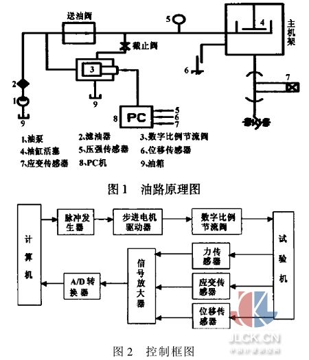 试验机系统由油源、主机架、液压集成块、三路传感器及PC机组成。油源采用高压柱塞泵;液压集成块上有电液比例阀,整体安装于油箱上方;应力通道采用压强传感器,应变通道采用自动消除载荷偏心影响的高精度引伸计,位移通道采用大量程位移传感器。