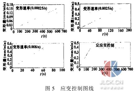 采用引伸计控制的系统应变速率控制范围从0・00025/s~0・008/s,并且在试样变形过程中可以进行定应变控制。图5为应变速率为0・00025/s、0・0025/s、0・008/s时的变形-时间图线以及定应变图线。