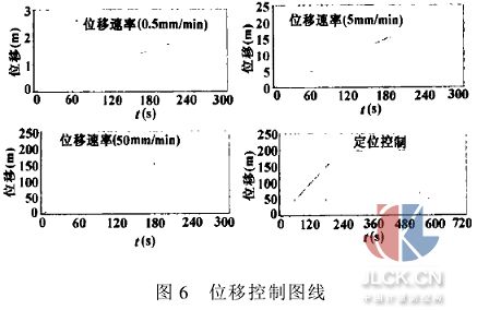 该系统试验机试台位移速度控制范围从0・5mm/min~ 50mm/min,其定位控制范围可从1mm ~200mm。图6分别列出了位移速率为0・5mm/min、5mm/min、50mm/min时的位移-时间图线以及最大位移时的定位图线。