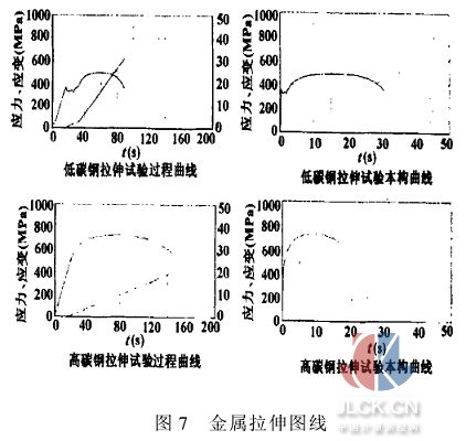 本系统进行低碳钢型材料拉伸试验时,应力控制与应变控制可自动智能识别及切换;高强钢型材料拉伸试验时,可自动智能测定σ0・2并按标准改变控制方式。图7分别列出了低碳钢型材料和高碳钢型材料拉伸试验时的应力、应变-时间图线和材料本身的应力-应变图线。