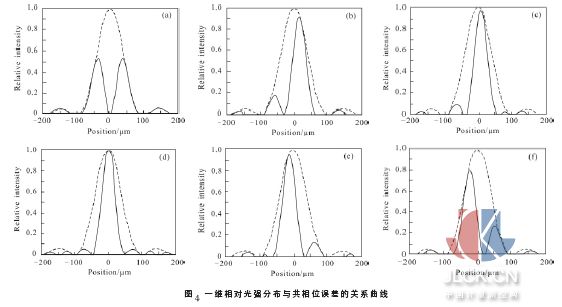 式中:a, b 分别为光阑的长和宽;δ 为分块镜之间的共相位误差;k=2π/λ 。衍射-干涉图随共相位误差的变化而变化,如图4 所示,图中,(a)~(f)是共相位误差分别为-0.5λ ,-0.25λ ,-0.1λ ,0,0.15λ ,0.3λ 所对应的一维衍射-干涉图, 虚线为包络曲线, 横轴为位置坐标,纵轴为相对光强。衍射-干涉图随共相位误差的改变而明显不同。以图像中心为参考点,最高峰的峰值位置随共相位误差的变化而移动。图5 为最高峰的峰值位置与图像中心位置。共相位误差为零时,最高峰位于图像中心,随共相位误差的增大,最高峰上移(对应y 平面为左移)。共相位误差为负时,最高峰位于图像中心下侧(对应y 平面为右移)。