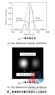 式中:m 为未知数个数;n 为采样点个数。在像元尺寸为5 μm、采样点为10 个左右的情况下,该峰值定位方法的定位误差小于600 nm,如表1所示,能够满足所要求的定位精度。图7(a)为一维光强分布图, (b)为在峰值左右取10 个点拟合得到的高斯曲线, 其峰值位置与原曲线的峰值位置误差为0.180 μm。分析光阑的衍射-干涉图的光强分布可以得出:在共相位误差为零时,像斑中心为一个大的主峰,两侧有小的侧峰,并且图像中心对称。随共相位误差的增大,像斑主峰逐渐变小,侧峰逐渐变大,主峰的对称性逐渐变差,当这两个峰一样大即共相位误差达到半波长时, 主峰的对称性最差,但是定位误差仍然在允许范围内。