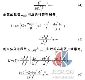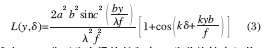 由公式(3)可知:衍射-干涉图的光强分布是sinc函数和余弦函数的乘积,最高峰的峰值位置是该函数L(y,δ )的拐点位置。对函数L(y,δ )求导数,导数为零的点即为拐点,但是,该函数的导数没有准确的解析表达式,需要对该表达式进行分析,得到零点位置。对公式(3)中的sinc 函数的平方在y=0 附近进行泰勒展开: