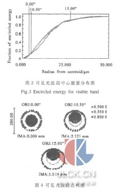 在可见光波段中,光斑的中心能量分布如图3 所示。从图中可知:80%能量光斑半径小于22 μm。可见光波段的点列图如图4 所示,从图中可知点列图的几何均方根值小于22 μm。