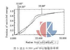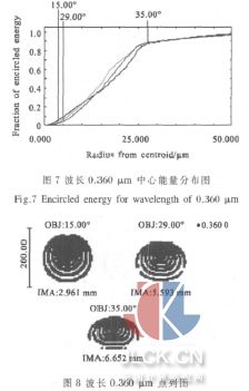 对紫外波段,像面需要往前移动约0.18 mm,图5表示波长为0.350 μm 时的中心能量分布, 从图中可知:80%能量光斑半径为28.5 μm。图6 表示波长为0.350 μm 时的点列图。图7 表示波长为0.360 μm 时的中心能量分布,从图中可知:80%能量光斑半径为25 μm。图8表示波长为0.360 μm 时的点列图。因此,在整个紫外波段内,光斑半径可控制在30 μm 以内。