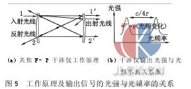 当激光照射在振动物体表面时,根据多普勒频移的原理,发射或散射光的频率发生了变化,变化的频率里加载了超声波的振动频率,干涉仪把频率的变化转变成光的强度的变化,经过一系列的处理手段,转变成电信号在示波器上显示出来,分析信号的特征就可以得到对被检测试件内部的情况。速度干涉仪对检测物体表面的速度特别敏感,对微振动有较好的检测能力。这种干涉仪有双光束干涉和多光束干涉,用的较多的是共焦的多光束干涉仪,也就是F-P干涉仪,它有突出的优于其他干涉仪的特点[4],图5所示是光线在干涉仪的传播路线及输出信号的光强与频率的关系。