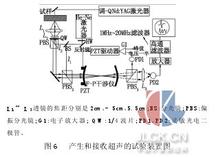 采用图6所示的工作系统[5],用一个调Q Nd:YAG激光器,打在被检测的试件上面,用一个He-Ne激光器在试样另一面来接收产生的超声波,信号检测取决于携带超声的激光束频率的频移,利用多光束干涉的特点,频率的变化转变成输出光强的变化,从而实现光学方法的超声检测。L1~ L3透镜的焦距分别是2cm、-5cm、5.5cm;BS:分光镜;PBS:偏振分光镜;G1:电子放大器; QW:1/4波片;PD1、PD2:灵敏光电二极管。