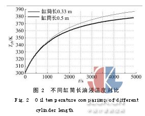 由图2可以看出,减振器其他参数确定后,筒长为0.33 m时,循环末端油液温度为387 K;当筒长为0.5 m时,循环末端油液温度为378 K。即随着缸筒长度的增大,油液在相同时间内的温升逐渐减小。
