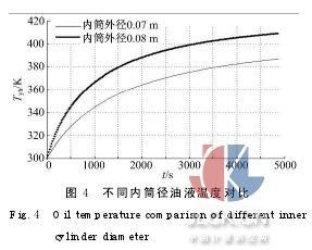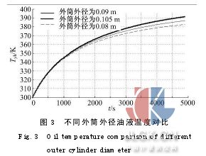 由图4可以看出,在减振器缸筒壁厚及其余参数确定后,当内筒外径为0.07 m,内径为0.065m时,循环末端油液温度为387 K;当内筒外径为0.08 m,内径为0.075 m时,循环末端油液温度为409 K。即随着内筒径向尺寸的增大,油液在相同时间内的温升逐渐增大。