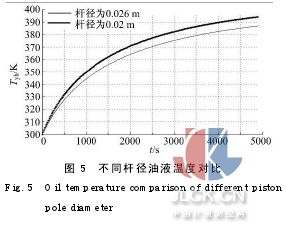 另外,由以上各图可以看出,随着时间的增加,油液温度逐渐趋于稳定,这是因为阻尼阀节流所产生的阻尼力与油液黏度有关。油液温度上升,分子运动加剧,黏度迅速降低,阻尼力不断减小,所消耗的振动能量以及转换的热量也减少,而随着缸体温度的升高,系统与外界环境温差越来越大,散热量不断加大,所以系统最终将达到一个温度的平衡点。